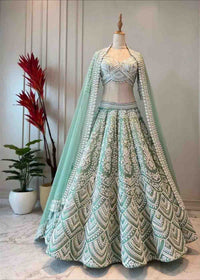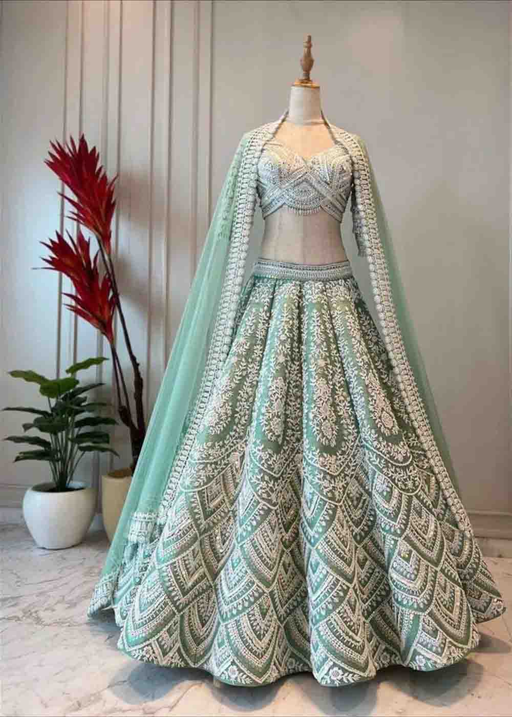 luxurious and iconic Mint green lehenga with ivory hand embroidery Sale