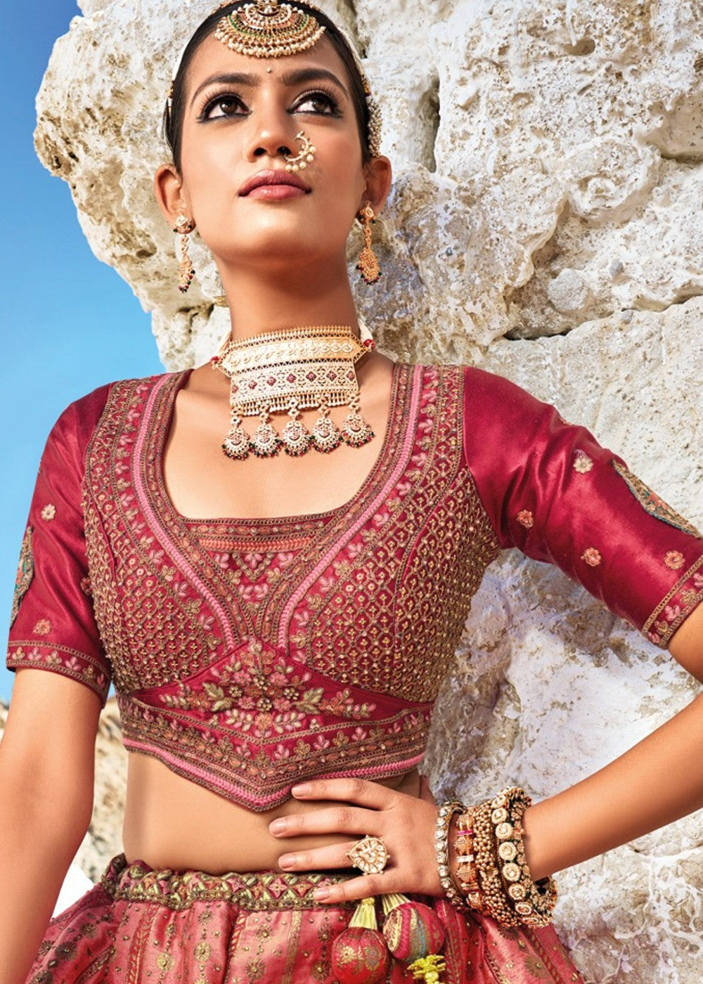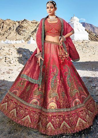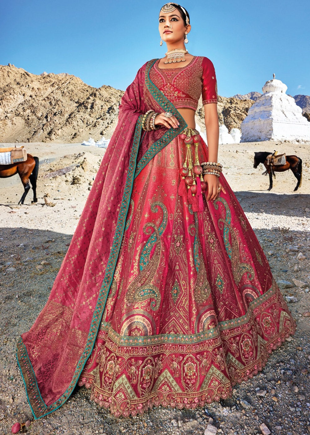 Elevate your style with our exquisite pink jacquard silk bridal wear lehenga choli, adorned with stunning Resham work and intricate embroidery.Complete the look with the matching silk dupatta.Shop now at Nusrat Exports for the epitome of elegance and craftsmanship.